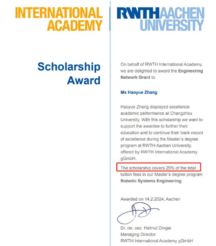 富豪娱乐城官网 张昊玥同学以优异成绩被德国亚琛工业大学录取,并荣获“合作高校优秀学生奖学金”(中国仅2名学生获此奖学金)。