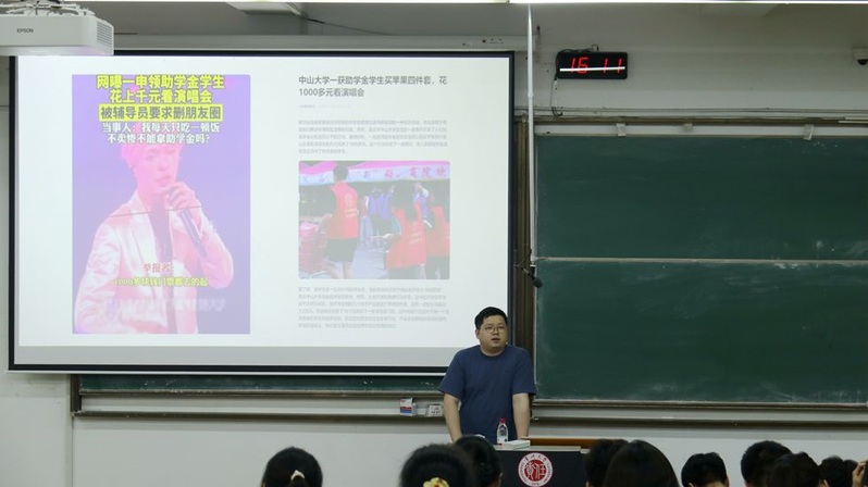 姚沁首先以网络上一申领助学金的学生花费千元抢购明星演唱会门票事件为引,引发了同学对助学金使用途径问题的讨论——申领助学金的学生是否可以享受高消费的娱乐活动。在讨论过后,姚沁就“诚信”这一品质对于大学生的意义展开论述,并从国家助学金设立初衷的角度,向同学们讲解了助学金是为了帮助那些有需求、经济状况困难的学生减轻经济负担,更专注地投入学习。受到资助的同学应该心存感激、积极进取、立志成才、回报社会,以切实行动回应国家的期待。最后,姚沁介绍了第五届“寻找诚信之光”手绘创意大赛,并鼓励同学们积极参加,将诚信与绘画结合,在活动中。