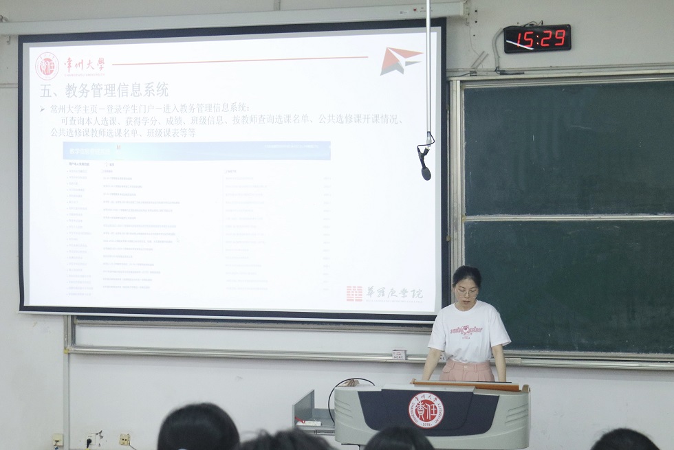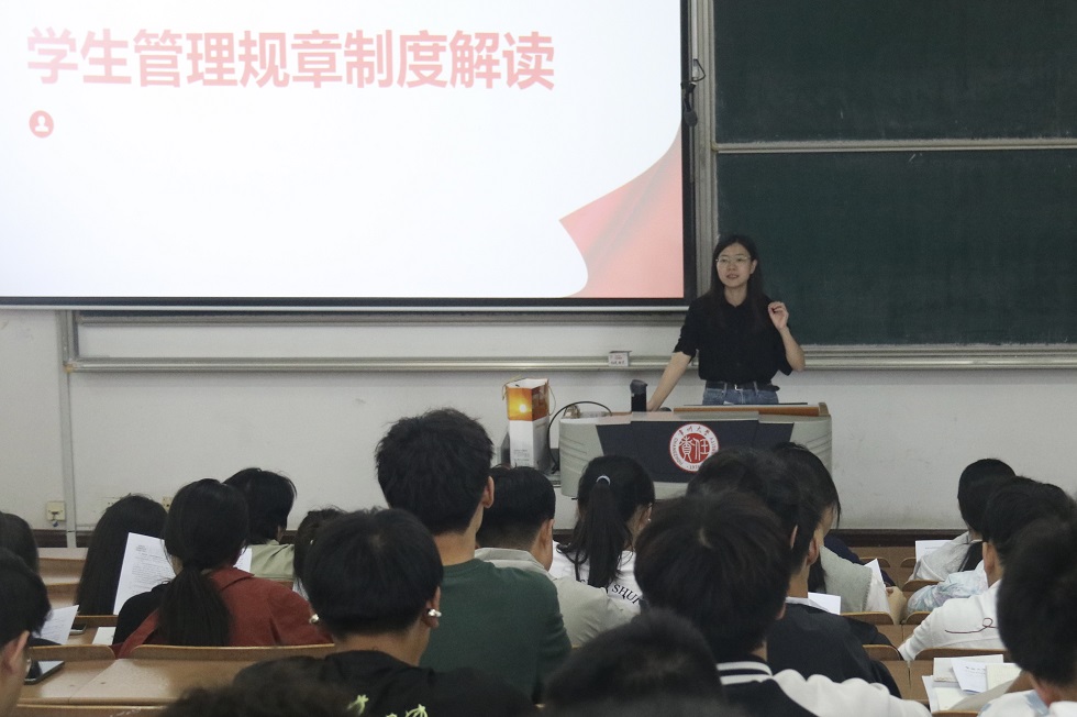 学工办主任席帅向同学们解读了学生转入转出、违纪处分、综合测评实施细则等文件,提醒同学们守纪律、讲规矩、重修养。她以往届优秀学子的奋斗事迹激励新生志存高远、脚踏实地,鼓励同学们专注学业,积极参与竞赛、文体活动,做德、智、体、美、劳全面发展的青年大学生。