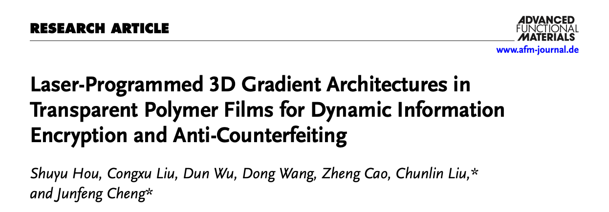 近日,富娱 231班刘从旭同学作为第二作者,其研究成果论文“Laser‐Programmed 3D Gradient Architectures in Transparent Polymer Films for Dynamic Information Encryption and Anti‐Counterfeiting”发表在国际顶级期刊《Advanced Functional Materials》(SCI一区,影响因子19)上。该论文由常州大学材料科学与工程富娱 成骏峰教授指导完成。