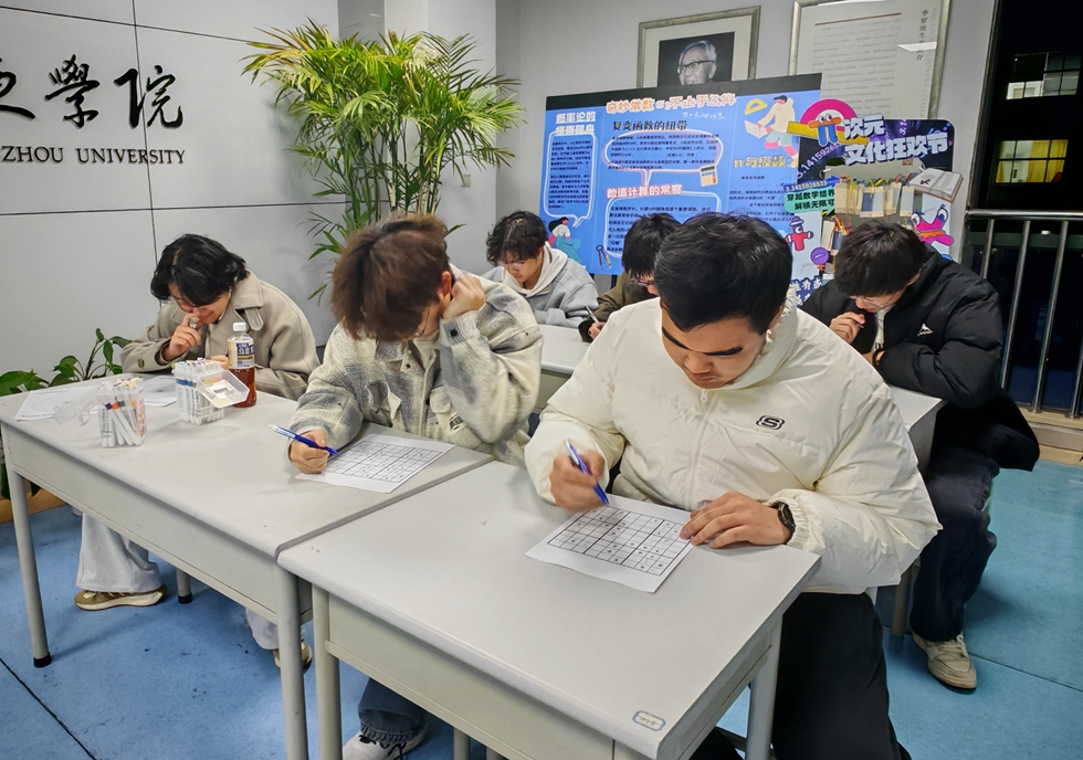 π次竞赛分设数独、图案填充、猜灯谜三大赛场。数独赛场,参赛学生凝神思索、严谨推演,在九宫格中梳理数字逻辑,展现扎实的逻辑思维能力;图案填充赛场,学生围绕2026国际数学日主题黑白纹样展开创意填涂,通过色块拼搭数学符号、勾勒对称几何与缤纷花纹,在创作中诠释对数理美学的理解与追求;数学猜灯谜环节,现场将数学知识、数字规律融入趣味灯谜,同学们积极思考、相互探讨,在解谜闯关的过程中深化对数学知识的理解,现场互动氛围热烈。